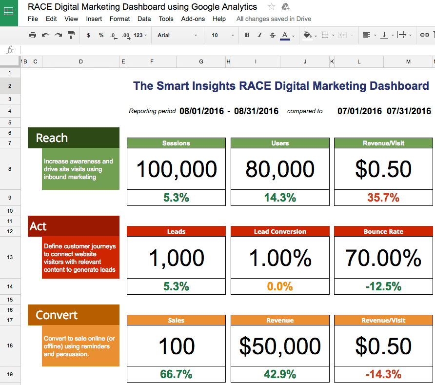 The purpose of the Smart Insights dashboard is to help managers to complete a regular weekly or monthly review of the current effectiveness of their digital marketing using Google Analytics with Google Docs Spreadsheets. We use this combination ourselves in our monthly reporting! The dashboard makes it easy to compare digital marketing performance through time with a focus on the key digital marketing measures across the customer lifecycle or marketing funnel defined across the Smart Insights RACE planning framework. For example, you can compare year-on-year or compared to the previous reporting period.