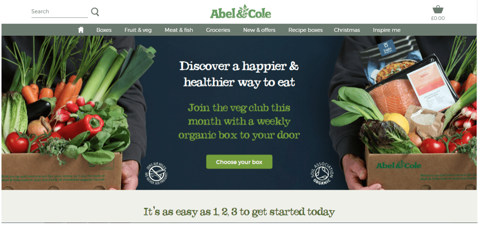 However, in addition to catering to these customers, Abel & Cole also prominently features a choose your box option on their main page that takes visitors directly to the place where they can select their box and place their order.