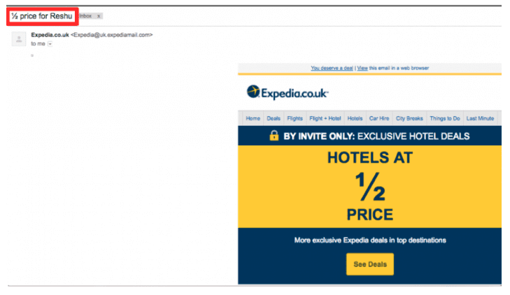 To learn how to personalize your emails take a look at this message from Expedia; they sent me this email after I searched hotels on their site: