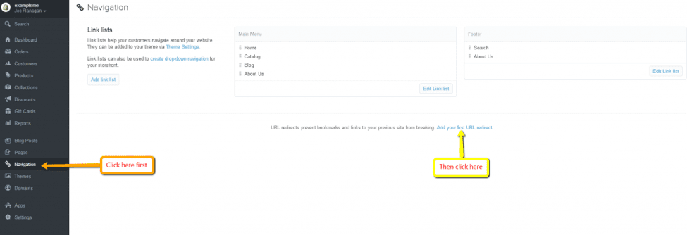 Online Store> Navigation> URL Redirects: