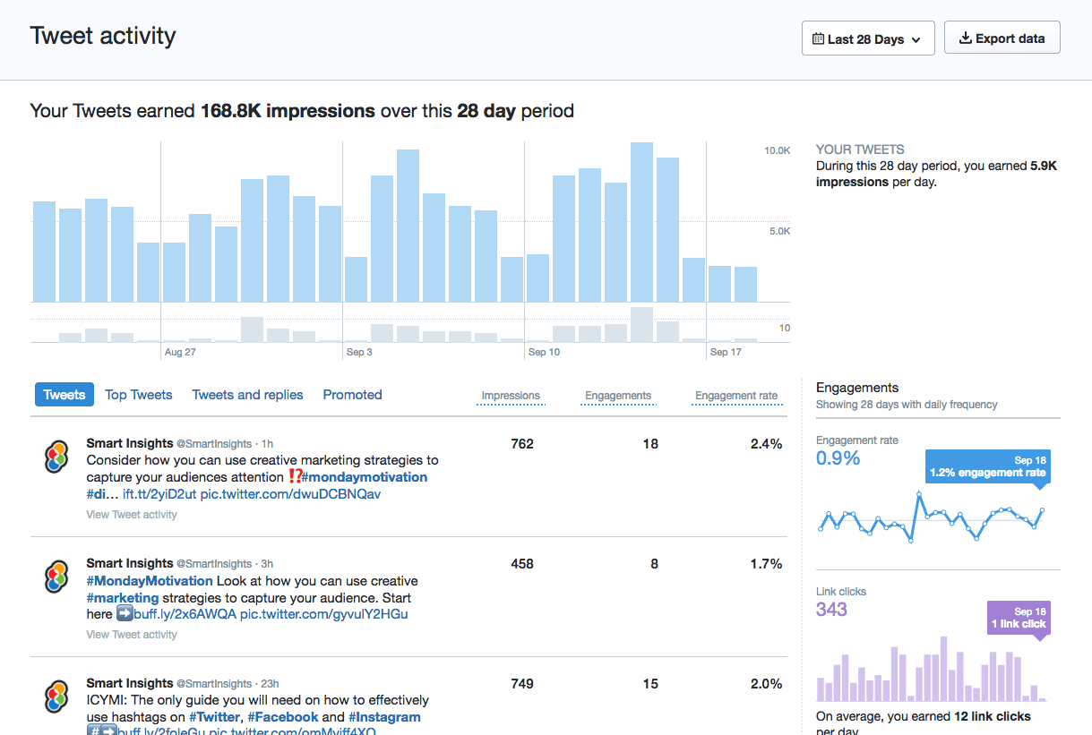 - Analytics - Twitter has its own version of analytics. This allows you to view metrics such as engagement rates, link clicks, retweets, likes and ‘impressions’ to help see what content is generating a higher response from your followers.