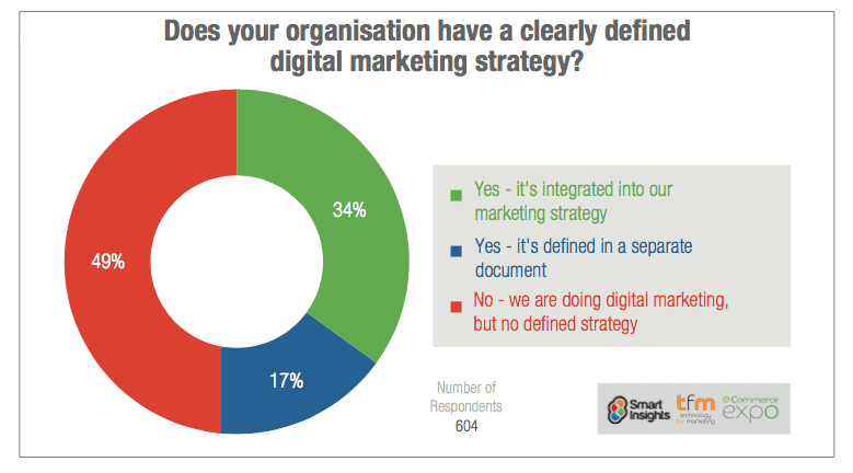 This figure suggests that many businesses are some way from 'post-digital’ and digital transformation is needed. Perhaps more fundamentally this figure suggests there isn’t a culture of planning in organisations. We have found in previous surveys that, more shockingly still, a similar proportion, > 50% don’t have a marketing strategy or plan on which to base or align their digital marketing strategy with!