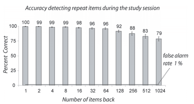 They found that participants were shockingly accurate at identifying the images that were actually flashed and were not fooled by images that were incredibly similar. In other words, they remembered the visual details of the images that were flashed and could distinguish subtle differences between the images that were flashed and the images that looked similar but were not actually flashed. In fact, for 2,500 images that were flashed, the accuracy was around a whopping 90%!