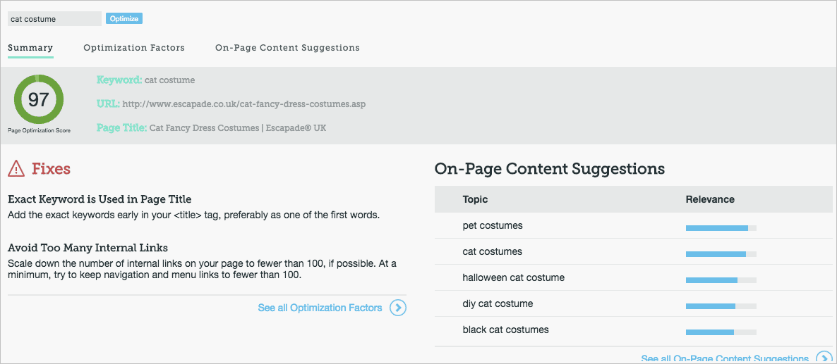 Finally, we have the Moz On-Page Grader, a tool which analyzes your page and compares it to their existing checklist of SEO factors. This tool will output a result that grades your page overall and also on a more granular level so that you can make improvements.