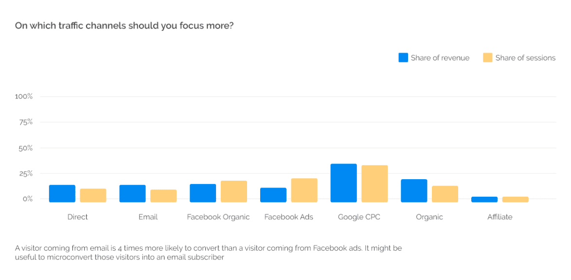 One dimension to analyze is the traffic source. Analyzing the traffic sources you can look to how many visitors are coming from x and y, but let’s pause for a second and think about what the focus of an eCommerce is: the conversions, right? That means the revenue per visitor is the most important metric. So if you are looking at the revenue per visitor and the total revenue, you see the global picture. But, the question is, which are the channels that are generating the highest revenue per visitor?