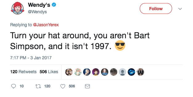 When it isn’t laying down absurd challenges, the restaurant has a habit of throwing shade on Twitter. When a Florida fan goaded the restaurant’s Twitter team into roasting him, Wendy’s obliged by mocking him for wearing a backward baseball cap: “Turn your hat around, you aren’t Bart Simpson, and it isn’t 1997.”