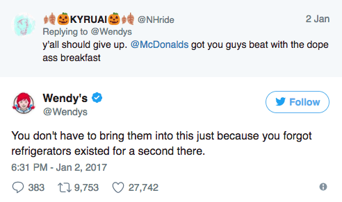 A barb like this might turn most people off, but Wilkerson told The Wall Street Journal that members of Generation Z “find getting into fights on Twitter funny.” In fact, the steady stream of sarcasm seems to be paying off as far as the brand’s social following goes. Wendy’s gained about 350,000 new Twitter followers in the wake of one particularly savage roast.
