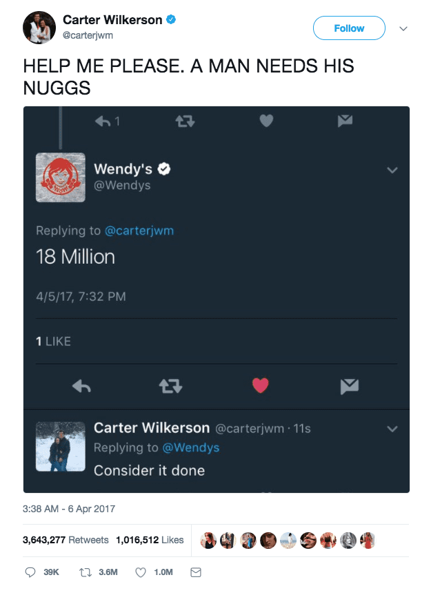 The latest person to benefit from Wendy’s social media buzz is 16-year-old Carter Wilkerson from Reno, Nevada. The teen asked Wendy’s how many retweets he would need in order to earn a year’s supply of free chicken nuggets. Not one to shy away from a challenge, Wendy’s took the bait and hit him with a snide reply: 18 million retweets.
