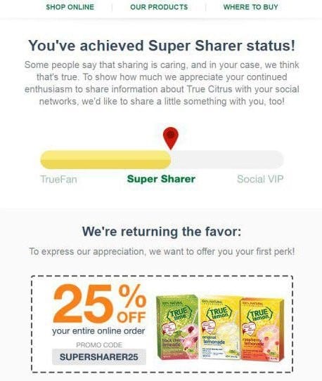 It works like a progressive discount when the quantity determines the price. Propose your email subscribers to share your Facebook link with their friends. The more referral followers your subscribers bring to your Facebook page, the richer loyalty program they are covered with.