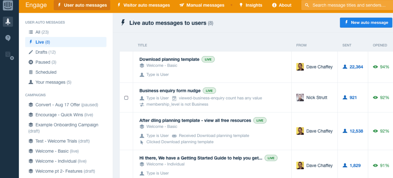 For most businesses, 1 and 2 are going to be of most practical application. It will be interesting to see how Chatbots prove to be, to end users. We’re certainly excited by the potential of Intercom, here is an example from our instance showing rules we have set up to trigger messages in real-time suggesting content to members. These give far higher response rates than email since they don’t suffer from inbox competition and are in the context of a website visit.