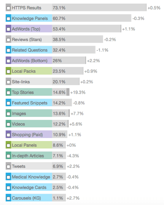 As you would expect, after AdWords, Knowledge Graph panels (common for brand searches and for famous people) and images are most important, occurring in more than 50% of searches. Other, more recent text-based features like Related Questions and Featured Snippets (also known as Quick Summary or Answer boxes) are now vital in many sectors, particularly in information queries such as needed by business-to-business marketing.