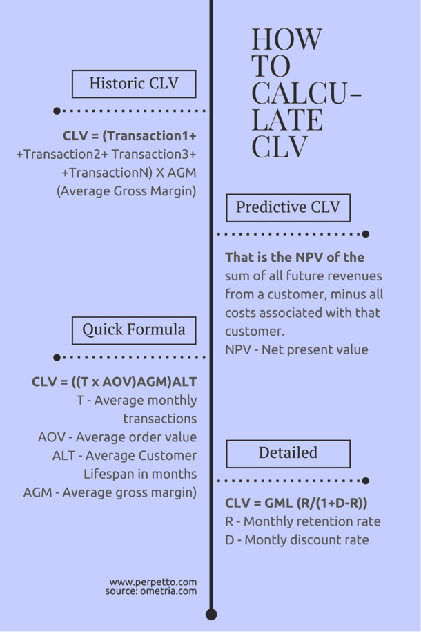 - HubSpot, CLV = (Average Order Value) x (Number of Repeat Sales) x (Average Retention Time)