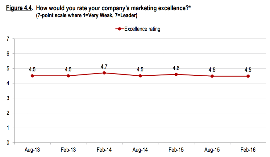 With big increases in marketing budgets, you’d think it would be reasonable to expect increased levels of skills among marketers managing the spend. However, data from CMO survey shows no discernable trend in increased marketing excellence. In fact, things remain pretty much stagnant.