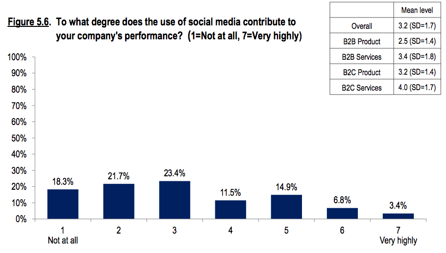 Social may be getting more ad budget, but is it delivering results? The answers seems to be maybe a little, but they’re not impressive. Only 3% of CMOs surveyed reported said social was contributing ‘very highly’ to the companies performance, whilst about a fifth said it wasn’t at all important to performance.