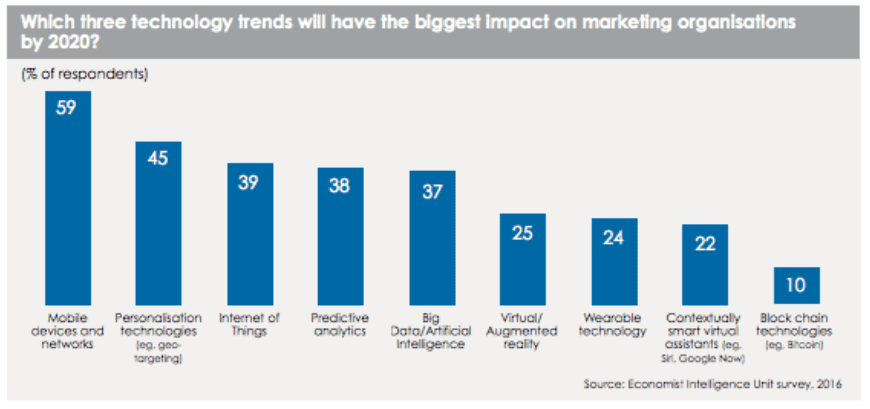 The Economist Intelligence Unit asked 499 (one can’t help but think they were aiming for 500) Chief Marketing Officers and senior marketing execs about how they saw marketing evolving, and also conducted some in-depth, one on one interviews with CMOs from leading brands such as Unilever and JPMorgan Chase. They were looking to find out what key technologies and trends will drive change in the marketing industry over the next four years, and the results make for interesting reading.