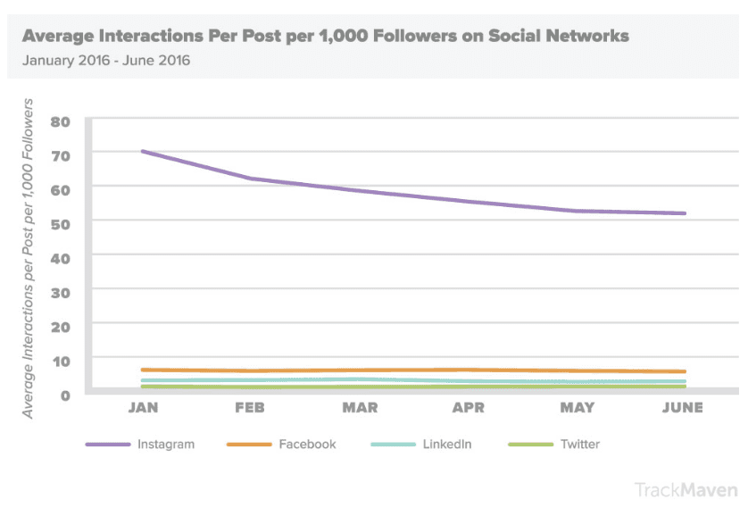 TrackMaven analysed 51 million posts from 40,000 different companies over 130 industries to establish which social networks achieve the greatest engagement per follower. The results show that Instagram absolutely dominates when it comes to interactions per 1,000 followers. In fact, it is so much higher than the other channels we’ve had to include a second chart just to show the difference between Facebook, LinkedIn and Twitter!