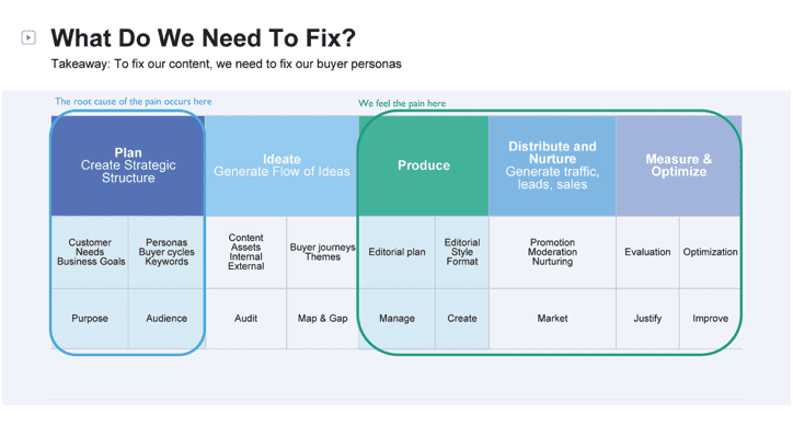 By the end we listed 10 top priorities. These needed improving first and foremost. Hence, we could have put the accent on improving content quality, but instead we put the accent on improving actionable personas. In other words content problems are referred problems that stem from further up the process. See below: