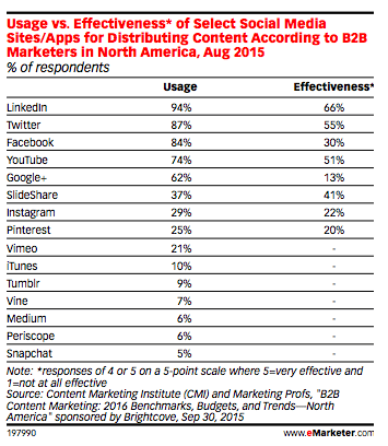 This research shows that B2B businesses tend to get the best results from LinkedIn and Twitter, but are present across a wide range of social networks. Youtube and Slideshare also stand out as particularly effective, whilst Google+ is very ineffective considering the majority of B2B businesses are using it.
