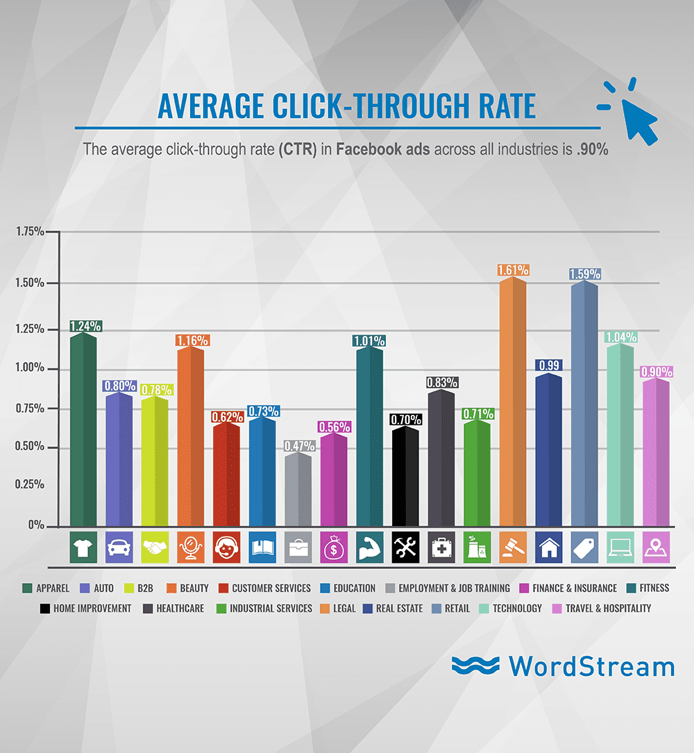 There is also newer 2017 research Facebook Ad CTR from WordStream’s Facebook advertising customers showing that across sectors clickthrough rates (CTRs) vary from around 0.5% through to 1.6%.