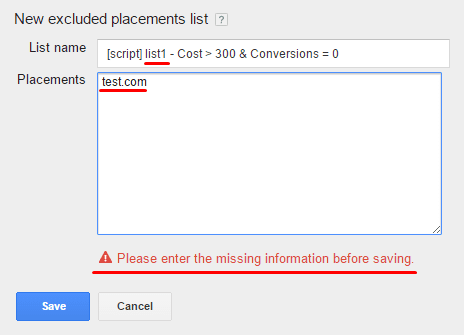 To save the list, add at least a single placement, e.g. “test.com”:
