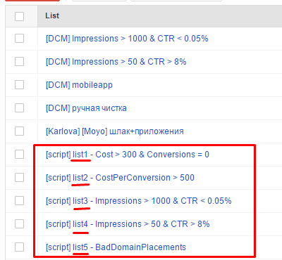 2. In our example, we have five new lists with restrictions regarding the values of cost, conversions, cost per conversion, impressions, click through ratio, and the name of domain: