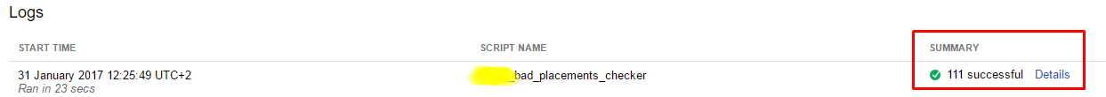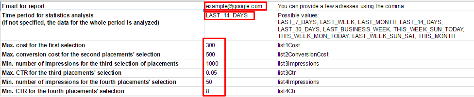To increase the script’s effectiveness, identify KPIs for the values of CTR, impressions, and conversions. Then, consider the period of time the placement requires to reach the desired KPIs. This will help you determine how often to run the script.
