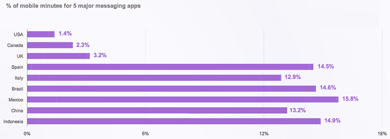 These 5 apps share 1.4% of all mobile minutes in the USA and 2.3% in the UK, but when you compare that against 15.8% in Mexico and 14.9% in Indonesia the difference is staggering.