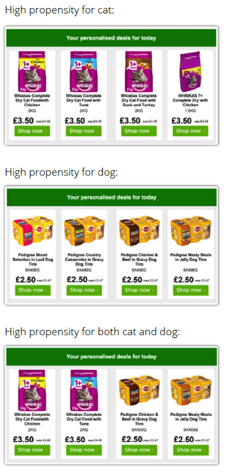 It’s easy to see how this works. For instance, if someone has a high probability of buying dog products, the are shown dog products in the email they receive, if they have a propensity for cats they were shown cat products. Baby otter? Even that would be possible. Of course, not many people have a baby otter to feed – but that is the beauty: because it is automated it can cater to the complete long tail of product offerings that are super relevant to just a few. Normally that would take up too much resources. Now it doesn’t. Cat and dog? Then they get 2 products from each category.