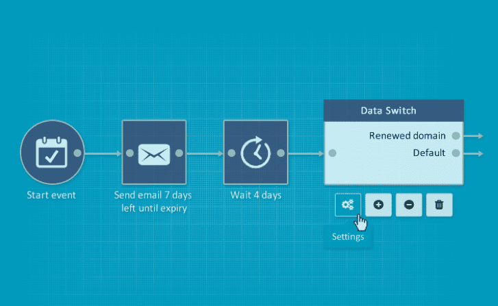 The following workflow in ExpertSenders’s platform automates renewal reminder notifications for customers that purchased a domain.