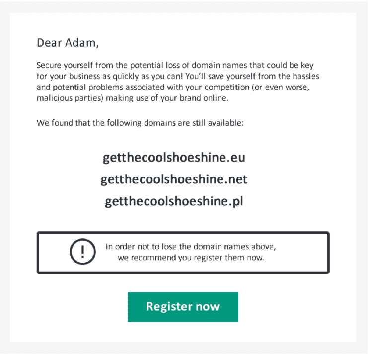 E.g. if they purchased the domain name getthecoolshoeshine.com, they might also be interested in purchasing;