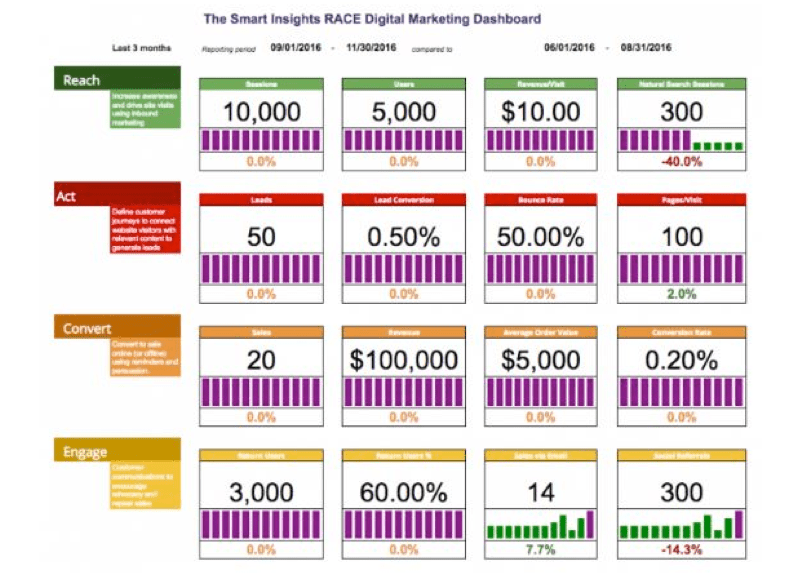 Modern marketers want peace of mind as they ensure that their week-to-week activities are paying off for the long-term. Smart Insights’ RACE dashboard focuses on KPIs with clear metrics that measure the effectiveness of your marketing over time, whether that means week-to-week, month-to-month or year-to-year. This example dashboard funnel covers engagement across the whole funnel and there is a more detailed channel view showing month-on-month and year-on-year changes which are essential views for a CMO which are difficult to create using custom dashboards in GA.