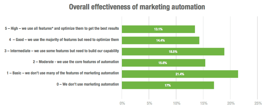 Our research showed a range of capabilities in Marketing Automation as shown in the chart. It was good to see more business are now making effective use of automation with over one-quarter (27.5%) rating themselves positively. Kudos to these marketers and businesses who have put in place the projects to plan and deploy lifecycle automation.