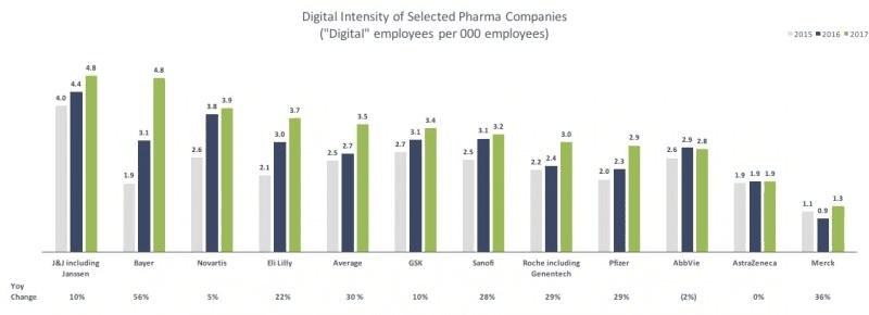 They recently repeated the analysis for a third year and found that Bayer has joined J&J/Janssen at the top of the table, with 4.8 digital employees per thousand, an increase of 150% since 2015 when it went public with its digital transformation project. Click on the chart below for an enlarged version.