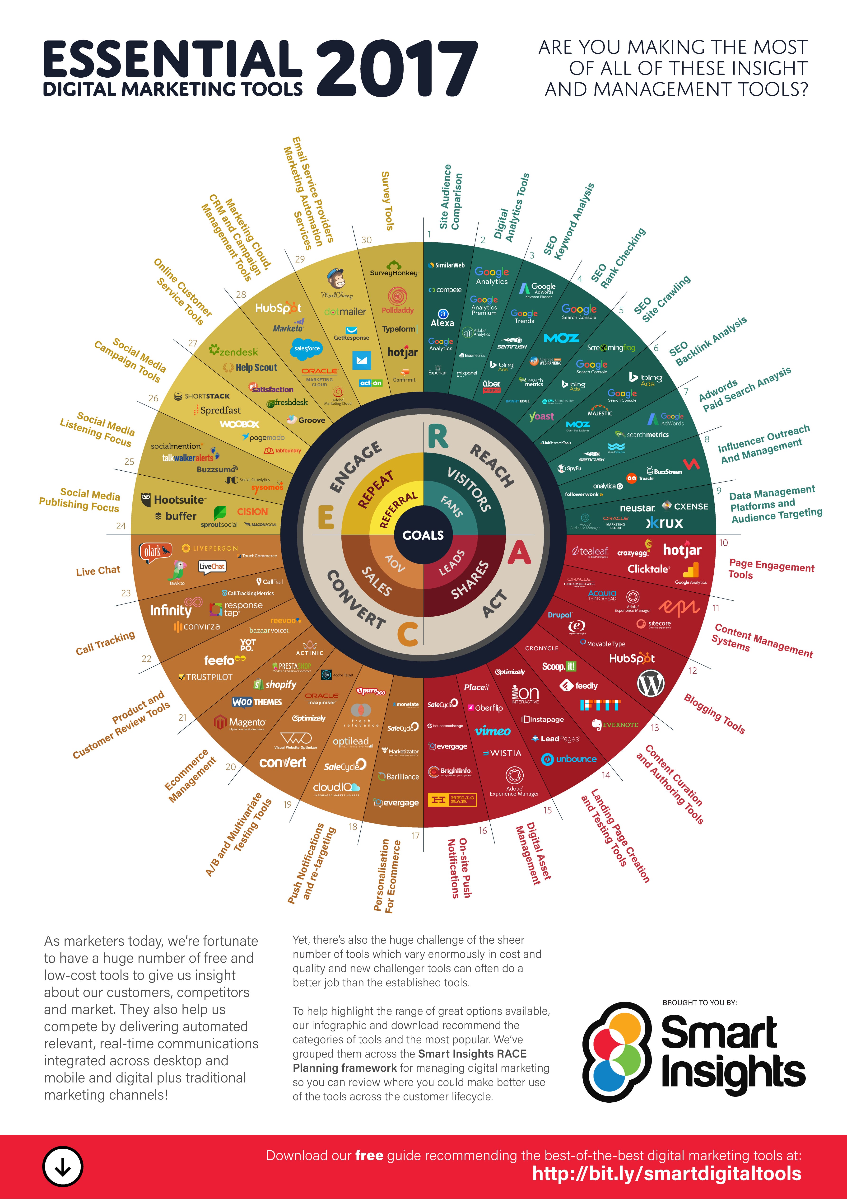 To help highlight the range of great options available, our infographic and free Digital Marketing Tools and Services 2017 download recommends 30 categories of marketing technology and our pick of the most popular 5 in each category. We’ve grouped them across the Smart Insights RACE Planning framework for managing digital marketing so you can review where you could make better use of the tools across the customer lifecycle.