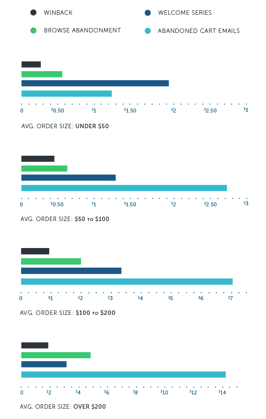 The below chart covers 4 activities, winback, browse abandonment, welcome series and abandoned cart emails. It’s then split into average orders from under $50 to over $200.