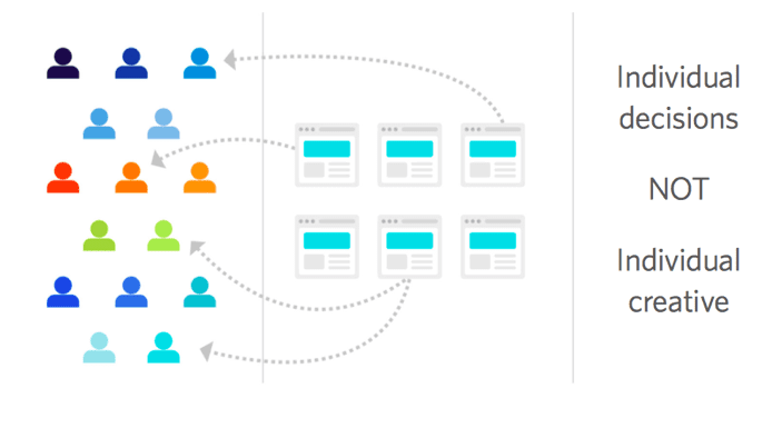 The method known as “segmentation” allows us to define distinct groups based on insights about the audience, so that we can target each group with creative tailored specifically for the segment. The problem with this approach is that those segments are defined by only a few data points and applying it at scale can be challenging. Customers who fall into a Women’s Urban Hipster segment may prefer different colors, styles, purchasing frequencies, price brackets and categories. This may all change based on their geography and time of browsing. Treating this group as a homogenous entity is a challenge as only some of them would be likely to respond favorably to an experience. We need a much more nuanced view of our customer population, one that may consist of hundreds of data points, not only a select few. So, while segmentation may help improve results for some, it does eventually reach a ceiling of effectiveness.