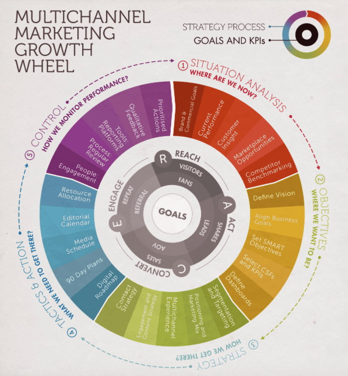 We recommend using The SOSTAC Planning framework to structure your plan and the RACE marketing framework to structure your implementation. Our multichannel marketing growth wheel is designed to help you do achieve this.