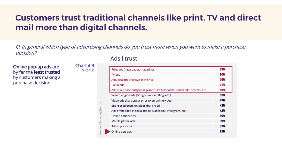 Customers indicated they trusted traditional channels such as TV, print, radio and outdoor ads, over digital channels such as search engines, sponsored blog posts and ads on mobile.