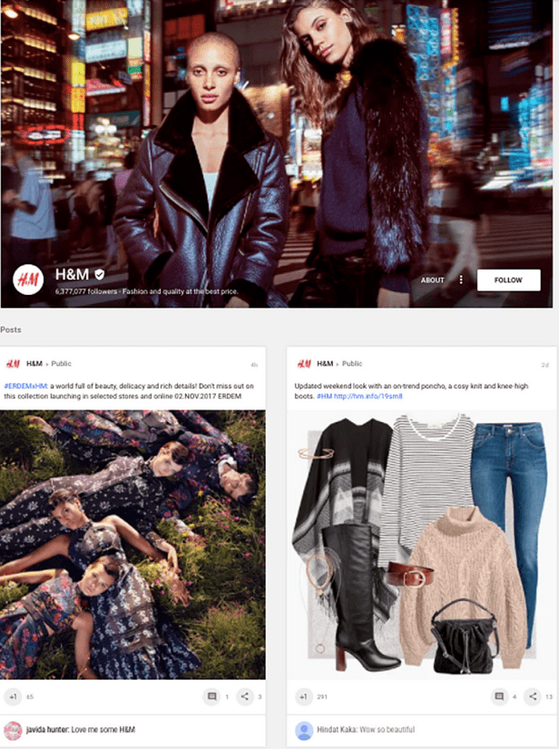 - H&M – Now with more followers than global high-end fashion brands, clothing retailer H&M shares collections and images of interest to their audience appending each post with a related #HM hashtag. Posts tend to be 1-2 per day, receiving hundreds of worldwide +1s on each.
