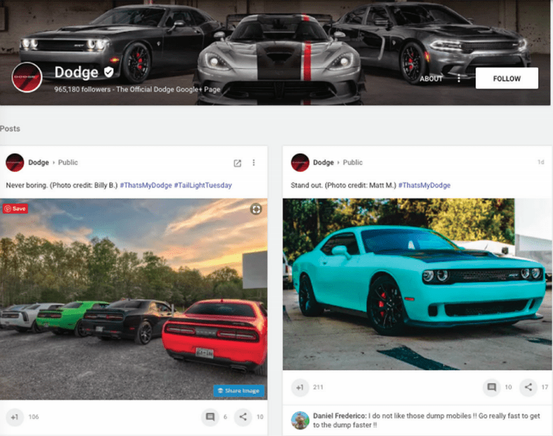 - Dodge - The brand page shares its own content but also images from fans to show off features or the history of the car designs.